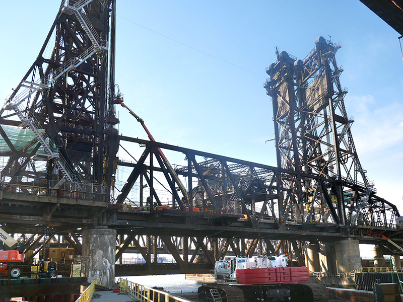 Before removal of the counterweights and main span began, Engineered Rigging assessed the vertical lift bridge’s structural integrity. For nine decades the bridge weathered countless storms, nor’easters and hurricanes, and carried over 50,000 vehicles a day between Jersey City on the east and Kearny on the west.